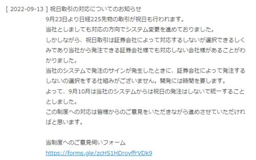 9月23日の祝日より証券会社によっては225先物の取引ができるようになるようです。 そのこと自体は歓迎なのですが、証券会社によってはできないところもあるようです。 それに対してオートレ社より下記のコメントが出されております。 ----------------------…