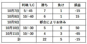 初日は利確/LCを5/-45で行い、その後利確/LC値を色々変えていきましたが、手数料も考慮すると毎日プラスにするのはかなり難しいようです。